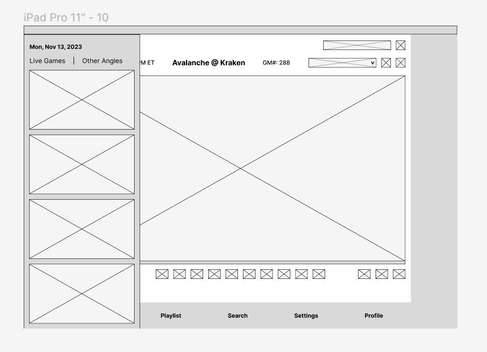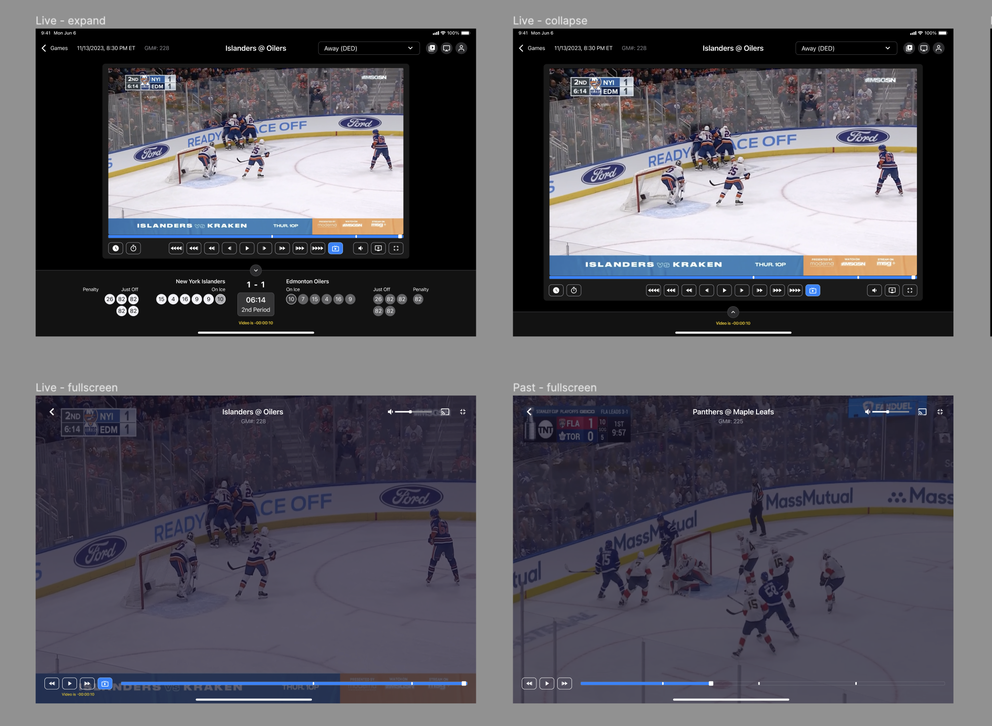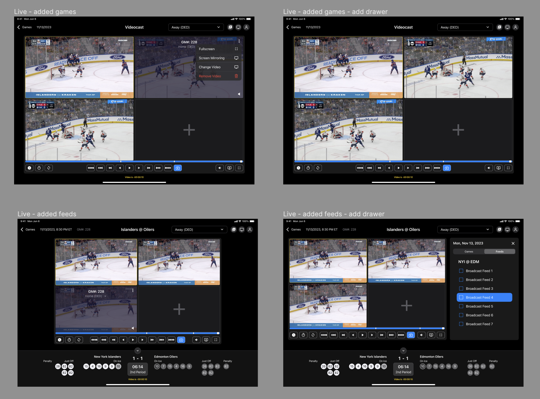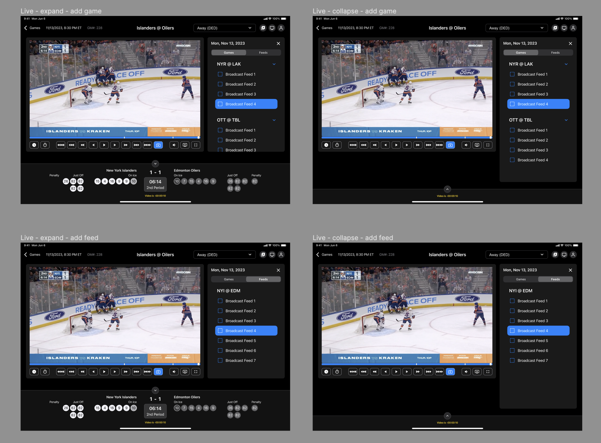Many iterations went into these mockups after meeting with all of the stakeholders. The following mockups include the ability to expand and collapse players on ice for live games, adding and changing up to 4 total games or broadcast channels to stream at once, and more.